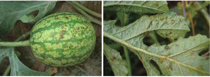 西瓜細(xì)菌性角斑病果實(shí)癥狀(左圖) ;西瓜細(xì)菌性角斑病葉部癥狀 (右圖)